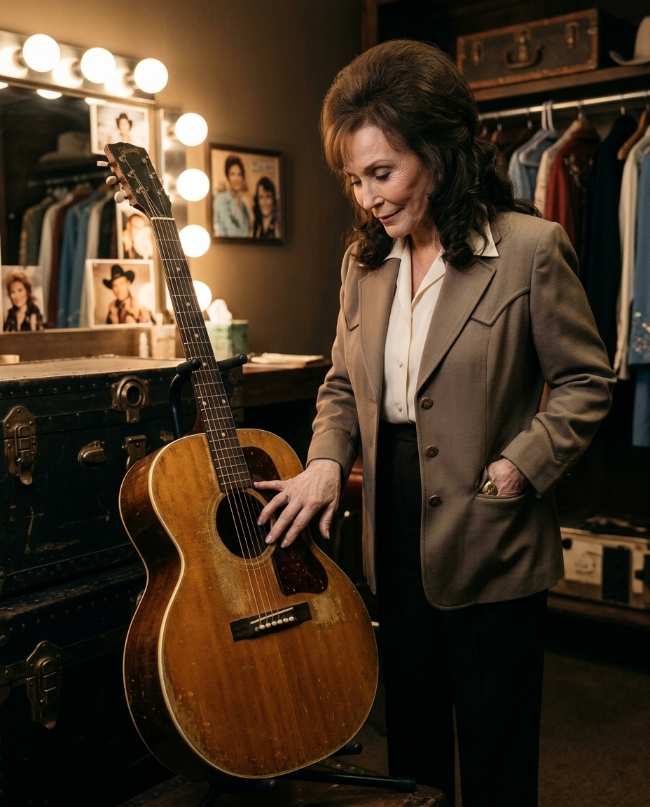 In the corner of her dressing room, usually leaning against a wall or resting near an old chair, sat a worn acoustic guitar. The finish had faded. The wood was scratched and dull. It was not the guitar Loretta Lynn performed with. It never went on stage. Nobody tuned it. Nobody moved it unless Loretta Lynn asked.
